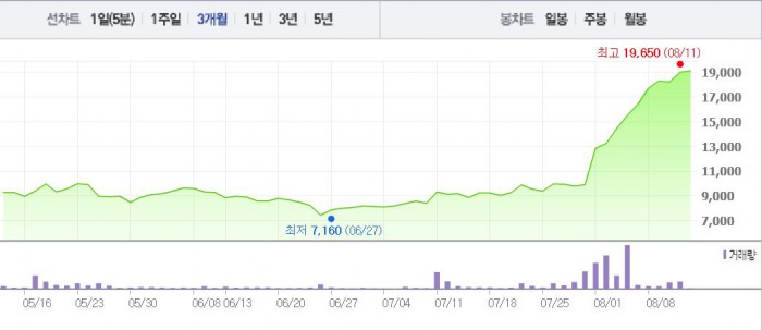 홈캐스트는 7월29일부터 이달 9일까지 1~29%의 상승폭을 나타냈다. 이는 1달 전 주가인 7월12일(9150원)과 비교했을 때 109% 상승한 수치다.