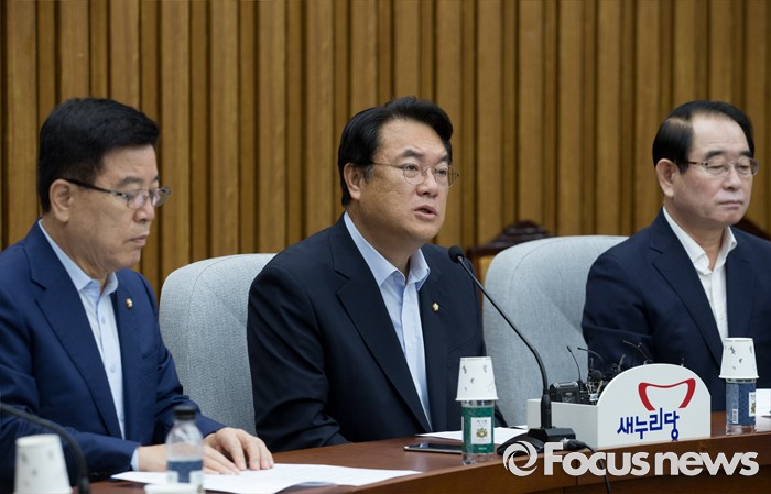 (서울=포커스뉴스) 정진석(가운데) 새누리당 원내대표가 12일 오전 서울 여의도 국회에서 열린 원내대책회의에 참석해 모두발언을 하고 있다.