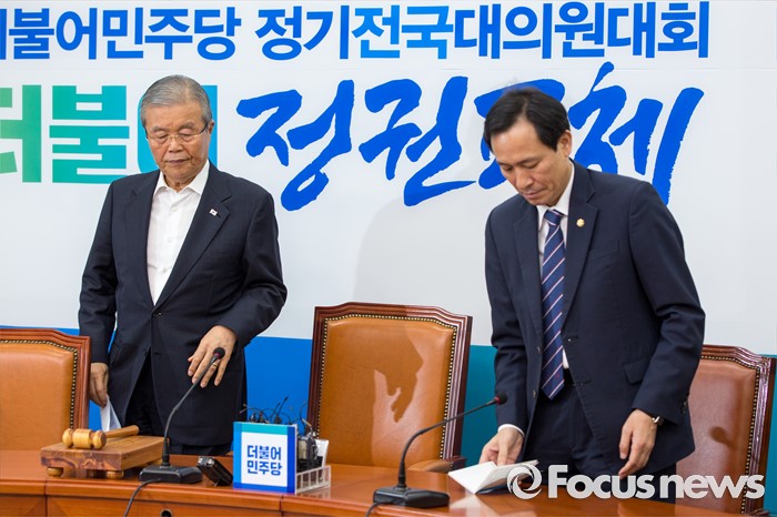 (서울=포커스뉴스) 김종인(왼쪽) 더불어민주당 비상대책위 대표와 우상호 원내대표가 12일 오전 서울 여의도 국회에서 열린 비상대책위원회의에 참석하기 위해 회의실로 들어서고 있다.